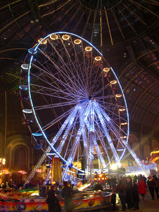 On arrive en famille donc, cinq euros l’entrée, pas de tarif famille. On paie, on entre, des vigiles aux gilets jaunes fluorescents s’agitent, on voit effectivement une grande roue derrière leurs épaules, et d’autres manèges à bras articulés qui vous retournent les tripes qui occupent tout l’espace du Grand Palais. Pour chaque attraction il faut débourser cinq euros de plus, par personne évidemment, une sorte de double paiement, ça vous rappelle quelque chose peut-être ? Comment cet argent est-il réparti ? Je propose cette hypothèse : les premiers cinq euros seront pour l’édifice public, qui a dû gérer l’installation de quelques tonnes de matériel et de câblages lumières. Les autres sont pour les forains, normal, ils sont installés dans le grand Palais, la place est chère. Un tour de grande roue, toujours magique, on monte à vingt-cinq mètres, on voit au loin la grande roue, qui concorde avec celle-là, en plus petit, la continuité commerciale est assurée par les chalets de Noël – du même propriétaire – disposés sur les trottoirs de celle qu’on qualifie de plus prestigieuse avenue du monde.