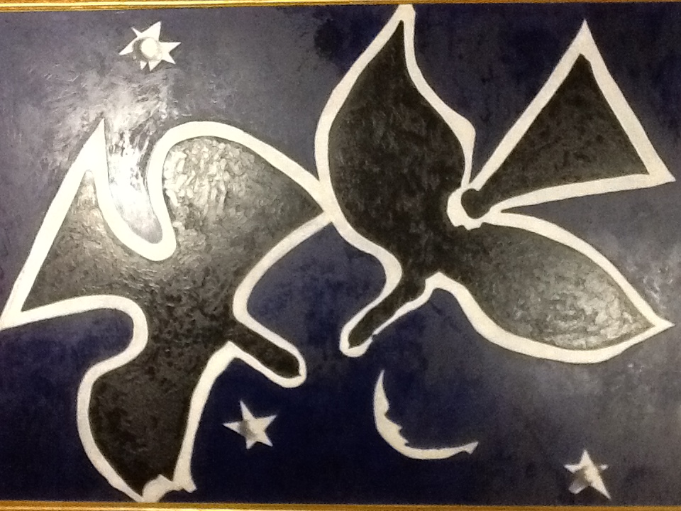 Le ciel obscurci dans un vacarme noir tremblant ; le sol en mouvement en tous sens ; des cris secoués ; d’abord isolés ; stupeur et tremblements ; dans la voix ; ces failles ; puis partout sourds suintants ; l’air épaissi dans une chaleur suffocante ; tout gris brûlant ; les gardiens du trésor à genoux ; glanant un peu d’air au raz du sol ; leurs narines palpitent ; l’un d’eux se jette sur les coupes les cuillers les louches les brocs richement décorés ; pour qui ce geste désespéré maintenant que le monde s’embrase ; sa grande toge de coton ; son corps de chair remparts aux argents aux ors ciselés ; susurrant d’incompréhensibles supplications ; pas un ne doute que bientôt c’en sera fini ; finies les fêtes orgiaques ; finis les chants et les danses ; finis les ébats langoureux ; finie la vie de richesses déployées ; fini le temps des paroles qui vous emportent la nuit aux chants des esclaves ; fini l’éclat de l’argent ; finie la splendeur de l’or ; la toge du gardien s’embrase d’un coup ; pas de cris pas de plainte ; à peine un râle qui déchire sa gorge brûlée de feu ; dans un sursaut de vie qui veut vivre encore il se retourne ; avec une grâce inouïe ; allongé maintenant sur le dos il protège le trésor de métaux précieux brûlants ; il cherche du regard à crever la voute bleu nuit de l’espace ; la seule qui lui soit accessible, car ses paupières déjà de cendre ; nuée ardente ; ses yeux encore humides cherchent une issue ; une trouée se forme fugace au-dessus de lui ; juste le temps ; ou le désir ; de voir deux colombes noires dans un ciel d’azur ; un jour ; demain ; plus tard ; il les peindra.